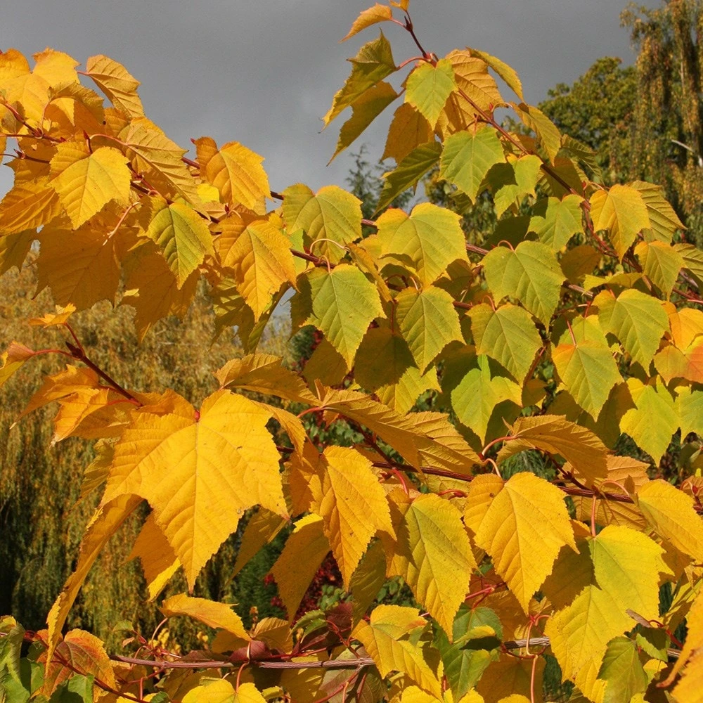An upright, spreading, deciduous tree for small gardens or backs of borders that provides eye-catching winter interest with green and white-striated bark. ‘Viper’ bears ovate, shallowly lobed, dark green leaves, flushed bronze in spring, that transition into vivid shades of yellow and orange in autumn. In late spring, small yellow flowers appear which, if pollinated, mature into winged seeds.