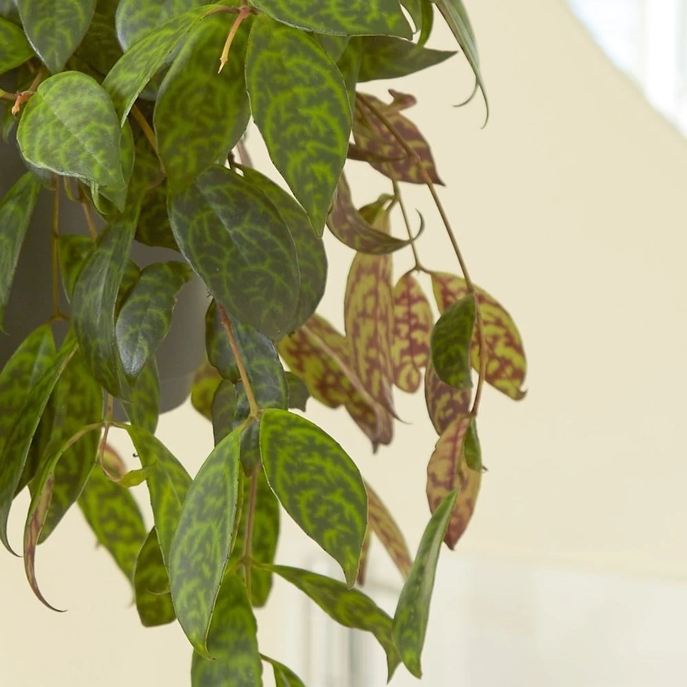 The trailing stems of this decorative house plant are smothered in marbled, green and cream leaves, each of which has a red-patterned reverse. In its native environment (forested areas of Thailand, Malaysia and Vietnam), it can be found growing in the crooks of tree branches, but here in the UK, it makes a very attractive house plant.