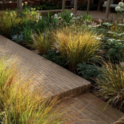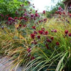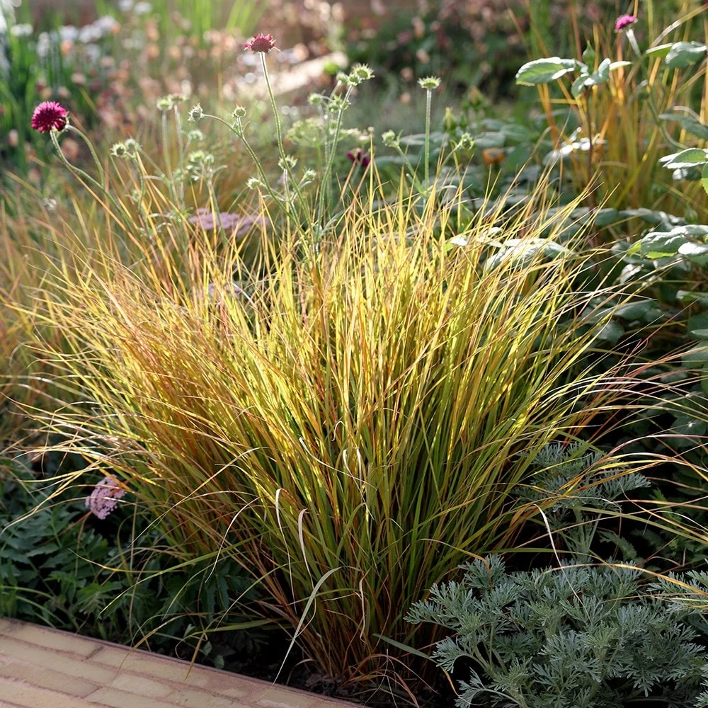 Pheasant’s tail is a wonderful grass that provides year-round colour, movement and structure. It forms a fountain-like clump of slender semi-evergreen foliage, which emerges green, but develops irregular yellow, orange and red spotting and streaking. This colouring becomes even more intense during the colder months of the year and the overall effect is very pretty. An added bonus is the sprays of airy flowerheads, which appear in late summer.