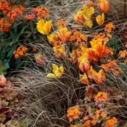 From spring to autumn the pale olive-green leaves of this ornamental grass turn a warm coppery-orange through the winter. In midsummer it bears small, brown flower spikes. Although it will take some shade, it colours up best in full sun. Grow it among other grasses or perennials, as a specimen plant, or in a large pot.