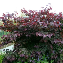 Deep purple, heart-shaped leaves on a spreading, often multi-stemmed tree. In spring, crimson, purple or pink flowers appear on the bare stems but it is the leaves which make this tree so attractive. The colour becomes subdued in summer but it is one of the best coloured-leaved small trees. Like Cercis siliquastrum, it prefers a warm, south-facing spot. ‘Forest Pansy’ will eventually grow into a medium to large tree, though not to the height expected of a single-stemmed form.