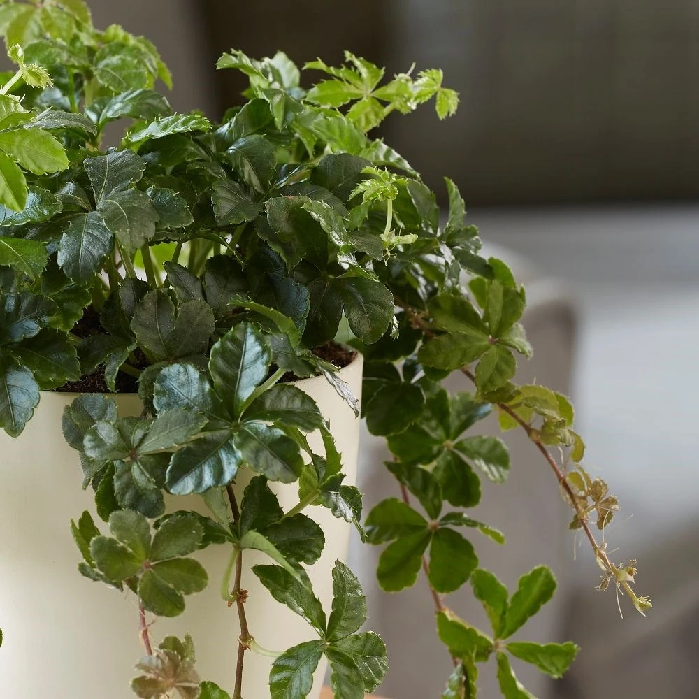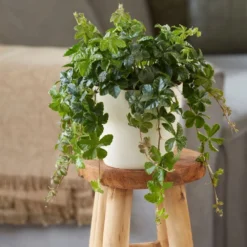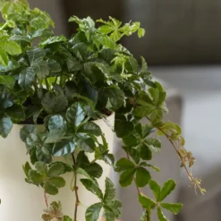 A beautiful (and unusual) trailing house plant, with lax stems that are clothed in fully divided leaves, which radiate out from their stalks like lush green starbursts. It looks great when placed on top of a cupboard (or on a shelf), so the foliage can cascade down.