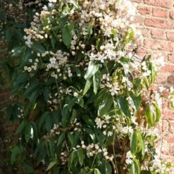 A fantastic, evergreen, twining climber, with handsome, long, lance-shaped leaves that will cloak a wall or fence within a few seasons. In early spring, it’s smothered in fragrant, star-shaped, creamy-white flowers and the new leaves are bronze-tinted. Plant near a doorway to enjoy the scent, and give it plenty of room to spread out.
