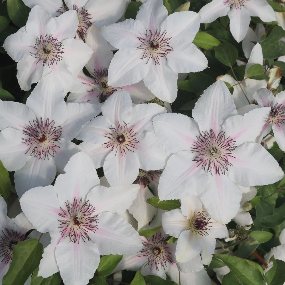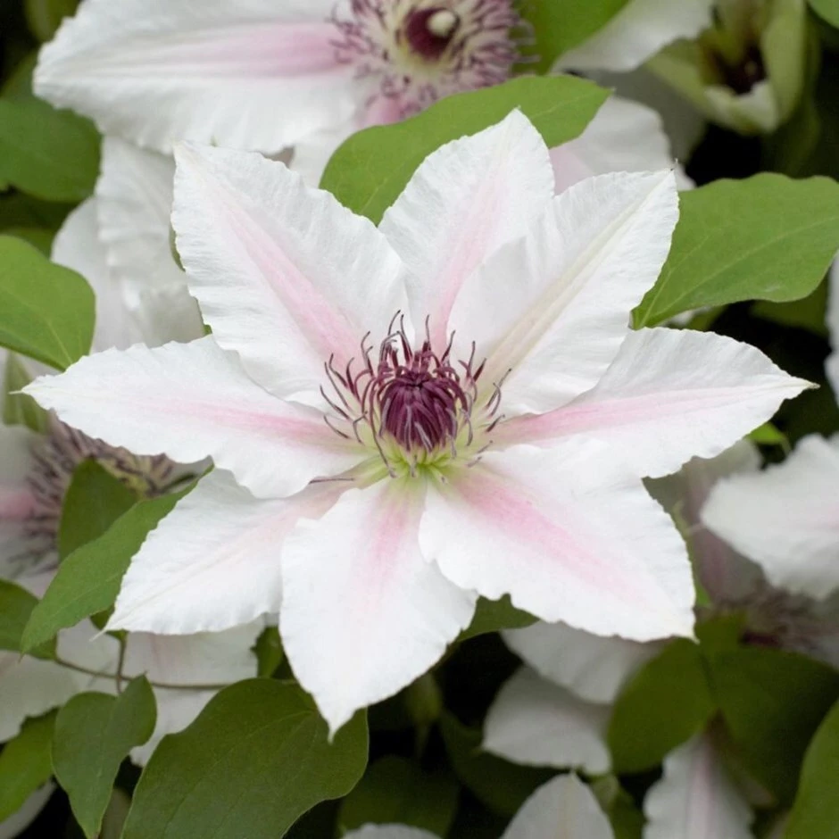 A long-flowering, creamy white ‘apple blossom’ clematis with a blush pink bar running along the centre of each petal. A wide central boss of reddish-purple stamens completes the flower (up to 17cm in diameter) making ‘Countess of Wessex’ a stunning and modest climber that would compliment most planting schemes from late spring to early summer and again from late summer to early autumn. Great for growing in a container, a pot or the patio garden, or for sheer indulgence when scrambling through Rosa ‘Dunham Massey’.