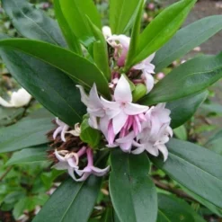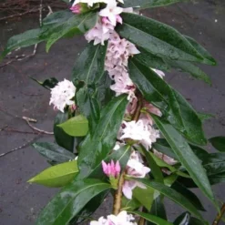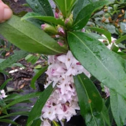 Daphnes do best, and prefer to be in the ground (rather than in containers), where they enjoy a deeper, cooler root run. Best in well-drained but moisture-retentive soil that contains plenty of organic matter, they won’t tolerate drought or waterlogging. Avoid excessive root disturbance during planting and keep pruning to a minimum since the plant is susceptible to die-back. Where necessary after flowering, lightly trim to remove misplaced branches in order to maintain a compact habit. Shelter from cold, drying winds. Cold hardiness can be improved by insulating the roots and soil surface with a thick (2in) layer of mulch and protecting foliage from severe or prolonged frost with a covering of horticultural fleece.