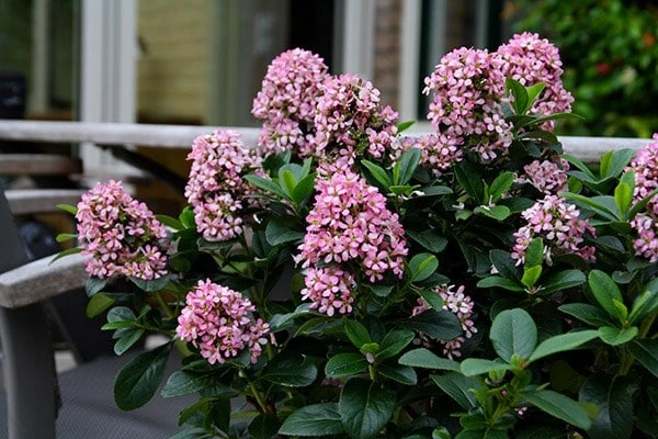 Larger than average heads of pink flowers form in abundance at the ends of the branches of this compact evergreen shrub in early summer. Usually in early autumn there is a second, less prolific flush that will add another shot of colour to the shrub border. The foliage is a rich glossy green, and this looks great all through the year, even when not providing a backdrop for the flowers. This recently introduced form is already winning awards and will make a fine specimen for pots. Its naturally branching habit also makes it ideal for hedging.