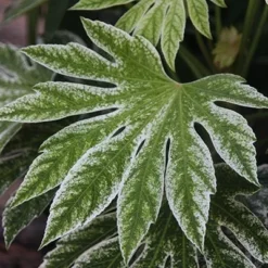 This new fatsia is primarily grown for its handsome foliage, which looks as though it has been variously dusted with icing sugar – with some leaves having had a more generous dusting than others! It makes a wonderful specimen, particularly when planted near white-flowering plants that complement the leaf variegations. It can also be used to help add light and colour to areas of lightly dappled shade. Shown here planted alongside Agapanthus.