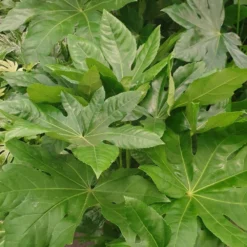A handsome, tropical-looking, evergreen shrub that’s deservedly popular. It has huge, glossy, deep green palmate leaves and in autumn, produces showy panicles of spherical, creamy white flowers, which are often followed by round, black fruit. Try it in an exotic-style garden, where the large leaves team well with bamboos and grasses, or as a focal point for a shady corner.