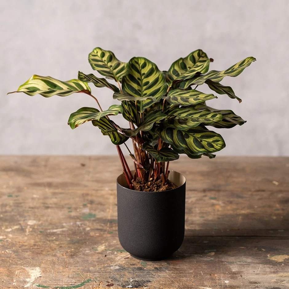 - Shop the look: Charcoal metal pot cover with metal interior Ø13cm The name may not be familiar, but their ‘praying habit’ might be. These popular houseplants have a curious habit of raising and lowering their leaves over the course of a day. It’s also a distinctive houseplant with broadly ovate, pale-green leaves, fascinating dark green markings and red-purple undersides.