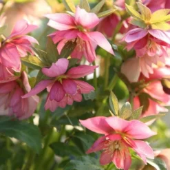 Showy, nodding or outward-facing, saucer-shaped, pink double flowers appear from late winter to early spring. The handsome evergreen foliage is leathery, deeply cut and dark green. This lenten rose is grown from seed, so colour variations may occur, and some are speckled inside. It looks best planted in groups at the front of a partially shady mixed border, or under shrubs among spring-flowering bulbs. In former times, hellebores were planted close to cottage doors to prevent evil spirits crossing the threshold.