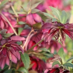 An unusual variety of hellebore with gorgeous, nodding or outward-facing, saucer-shaped red, double flowers with curved petals from late winter to early spring. The handsome evergreen foliage is leathery, deeply cut and dark green. This lenten rose is grown from seed, so colour variations may occur. It looks best planted in groups at the front of a partially shady mixed border, or under shrubs among spring-flowering bulbs. In former times, hellebores were planted close to cottage doors to prevent evil spirits from crossing the threshold.