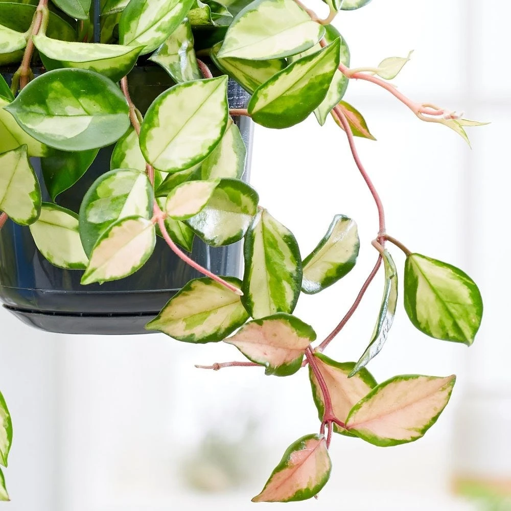 The fleshy leaves of this beautiful training plant have a waxy texture, and are variously patterned with green, cream and pink. It looks great when the stems are allowed to trail over the edges of a shelf or fireplace, and if it is grown in a bright spot, it may also produce clusters of soft pink flowers, which have a honey-like perfume.