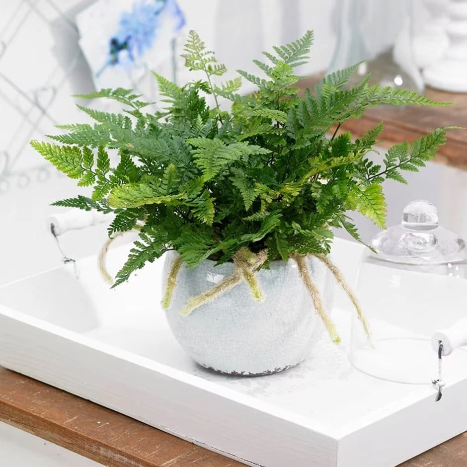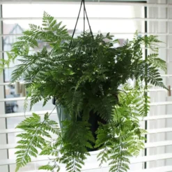 The foliage of this plush fern is a rich green, and it unfurls from softly hairy rhizomes that creep along the top of the compost and eventually dangle over the sides of the pot. This is one of the easiest ferns to grow. It will flourish in a brightly lit spot (away from direct sunlight), and as it loves high humidity, is happiest in bathrooms or kitchens – ideally away from radiators.