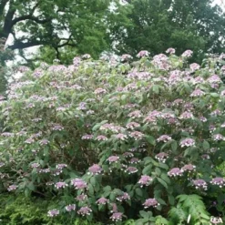 At close range, the coarse, hairy, dark green leaves of this hydrangea belie its quiet beauty. In August, flattened heads of tightly packed, blue purple flowers are surrounded by mauve florets that seem to glow as the light fades. This deciduous shrub has a naturally rounded form and the flowers are long-lasting and attractive to bees and butterflies. It makes an elegant statement towards the back of a partly shady border, particularly when planted with other hydrangeas.