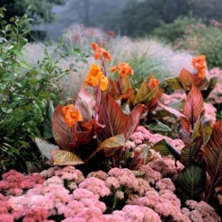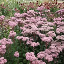 Succulent leaves, flushed with bronze, are held on purple stems, which in late summer, are topped with clusters of soft pink flowers. These not only look pretty, but they are highly attractive to bees and other pollinators – and they add a wonderful splash of late colour. Even after the flowers fade, the seed heads remain attractive, and these will often add interest throughout the winter. A valuable plant for the front of a sunny border, the flowers can also be cut for the vase.