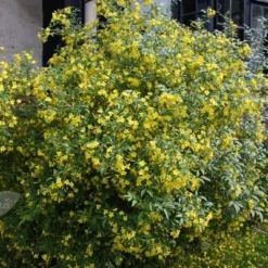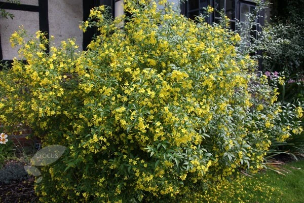 Larger than average bright yellow flowers appear in loose clusters in late spring and early summer on this bushy, semi-evergreen wall shrub. It makes a wonderful free-standing specimen at the back of the shrub border, or you can tie the arching branches flat against a wall to create a decorative wall shrub.