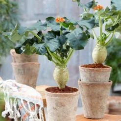 This distinctive plant forms a swollen, fleshy stem, which is topped during the warmer months with a crown of gently ruffled deep green leaves. In good conditions, the plant may also produce an upright stalk, topped with a cluster of small orange flowers – followed by near-black berries.