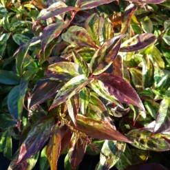 A pretty evergreen with arching branches of dark green leaves, heavily mottled with pink and cream. White, bell-shaped flowers are produced on long racemes in spring. This is a lovely shrub which is best suited to peaty soil in a shady spot, or planted in ericaceous compost in a pot.