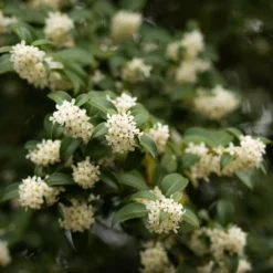 This popular, rounded, evergreen shrub has glossy, finely toothed, dark green leaves beautifully offset by highly scented, jasmine like, white flowers in mid and late spring. In flower, it will light up a shady corner of the garden and as an evergreen, makes a lovely foil for other flowering plants and ferns.