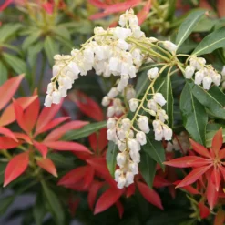 Glossy, brilliant red young leaves gradually turn pink, creamy white, then dark green. In late spring, clusters of pretty, ivory, nodding bell-like flowers appear, resembling lily-of-the-valley. The fiery red young foliage of this upright evergreen shrub will add a splash of vivid colour to a shady shrub border or woodland edge. One of the best varieties, this pieris needs a moist, well-drained acid soil and shade from morning sun.