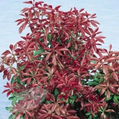 Glossy, brilliant red young leaves mature to chestnut brown and in late spring, clusters of pretty, ivory, nodding, bell-like flowers appear, resembling lily-of-the-valley. The fiery red young foliage of this rounded, evergreen shrub will add a splash of vivid colour to a shady border or woodland edge. Pieris needs a moist, well-drained acid soil and shade from morning sun.
