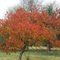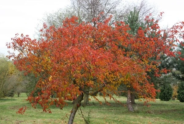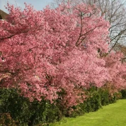 A bushy tree or shrub with sharply toothed dark green leaves turning vibrant shades of orange and red in autumn. Fragrant carmine pink flowers are produced in profusion in early spring. A lovely early-flowering cherry which looks great, even in small gardens.