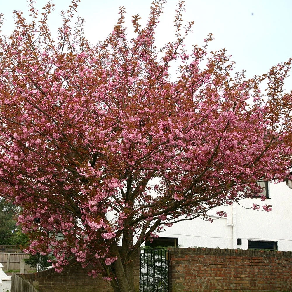 This is one of the most popular double-flowering cherry trees available. In spring the tree is laden with large double, deep pink flowers shortly before the bronze foliage appears, transitioning to a rich dark green. In autumn these dark green leaves turn bronzy orange before they fall. ‘Kanzan’ is a wonderful multi-season tree for a medium-sized garden, it’s perfect for avenue planting – or as a specimen tree in the lawn.