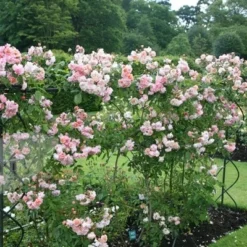 Large clusters of sweetly scented, double, apricot-yellow flushed light pink flowers from June to September and dark green leaves. This vigorous, shrub rose is renowned for its long flowering period and strong fragrance. One of the best Hybrid Musk roses, it makes an excellent specimen plant or informal, flowering hedge for an open, sunny site.