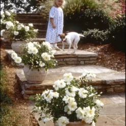 Free-flowering and disease-resistant, ‘Flower Carpet White’ is an AGM-winning rose with a low, spreading, dense habit making it particularly suitable for planting in large containers and as a ground cover when used in mass plantings or for low hedges. Flowering for several months (from midsummer to early autumn) if deadheaded regularly, the semi-double, white flowers bear yellow centres which contrast elegantly with glossy green leaves.