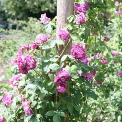 Many petalled, lilac-purple flowers are produced in a big flush in midsummer and then intermittently until autumn. They have a good fragrance and their colouring works well against the backdrop of the greyish-green foliage, which appears on near thorn-free stems. A beautiful rose with plenty of old world charm.