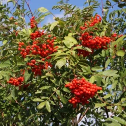 Rounded tree with mid- to rich green leaves that turn deep red and yellow in autumn, especially after cool summers. Sprays of tiny white flowers cover the tree in late spring, followed by bunches of red berries in autumn. Berries are quickly eaten by birds making it ideal for a wild or woodland garden. This conical-shaped tree can also tolerate harsh conditions and is perfect for a small urban garden.