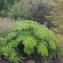 With deeper divided lobes, and a softer beige fuzz to the leaves than the species, ‘Rex’ is a fast-growing, exotic and architectural woody shrub bearing huge, deeply lobed, fresh green leaves up to 60cm across. Creamy pompoms of flowers are produced in large sprays in autumn, followed by black fruit if kept in a sheltered southerly-facing spot. A wonderful plant for jungle schemes in milder areas.
