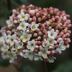 Domed clusters of fragrant, white flowers opening from pink buds in May and broadly heart-shaped, dark green leaves, turning red in autumn. This deciduous, spring-flowering viburnum is perfect for partly shady areas of the garden. To fully appreciate the splendid scent choose a site close to an entrance or path.