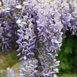 Magnificent clusters of well-scented, red-flushed, violet-blue flowers appear on this vigorous twining climber from late spring to early summer. The foliage emerges soon after the flowers, and often has an initial bronze flush, which fades as the leaves mature. If possible place it near a seating area or walkway, so you can fully appreciate the fragrant blooms, and provide a sturdy support for it to climb over.